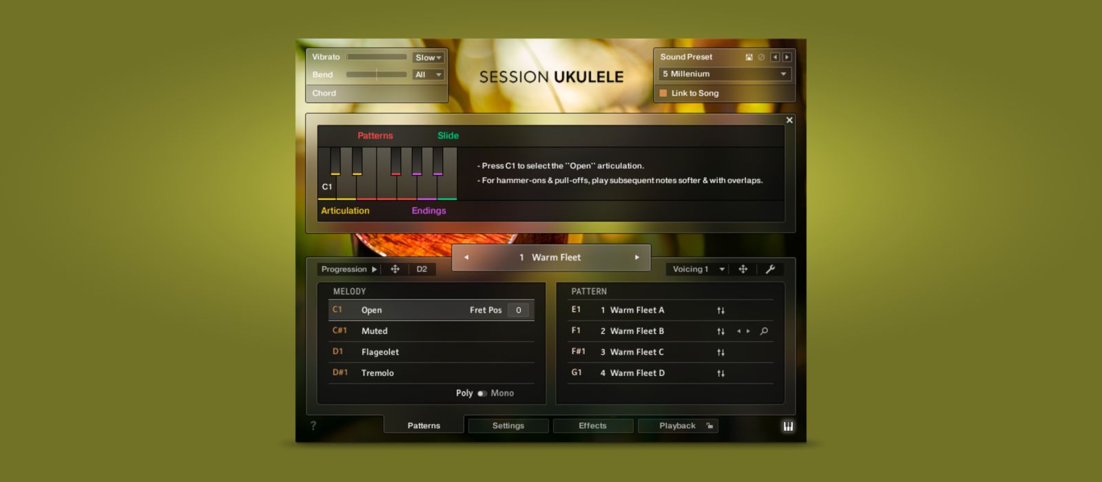 Session Ukulele提供与我们的Kontrol S系列键盘的完全集成。利用Light Guide来显示关键范围、发音和表达技巧,如幻灯片和静音,允许您在中段在演奏风格和发音之间轻松切换。