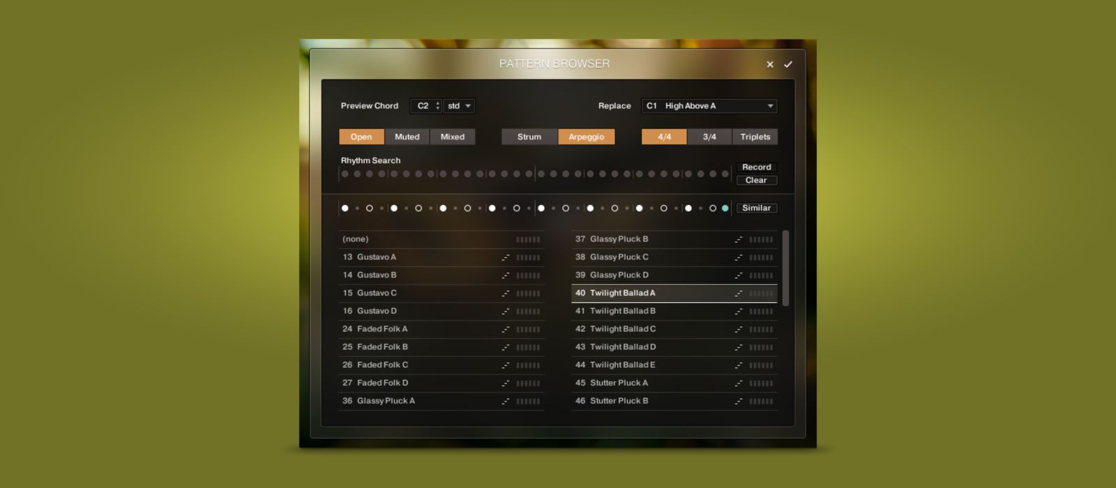 逐音符创作自己的旋律,或探索新改进的弹奏算法带来的385种模式。歌曲预设使在模式之间切换变得简单,而引擎将自动选择最自然的声音和弦反转。您还可以将模式拖放到DAW中以进行进一步编辑。
