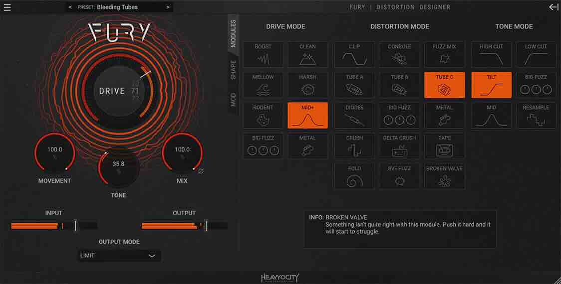 Fury 的核心在于其灵活性。与传统的只有“Drive”和“Tone”旋钮的失真插件不同,Fury 允许你构建自己的信号链。