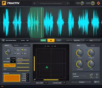 - 切片与拉伸 (Slice and Stretch):Fractiv 的 XY 垫允许你在搓擦声音的同时,调整颗粒大小 (Grain Size) 和位置 (Position)。这种精确的、动手的控制解锁了全新的声音可能性。LFO 还可以设置为“链接”模式,动态匹配 LFO 频率与颗粒大小。