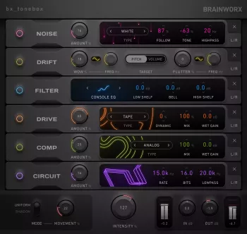 - 模块化创意机架 (Modular Creative Rack):拥有六个专用音色模块:Drive (驱动/失真)、Circuit (电路模拟)、Drift (漂移)、Comp (压缩)、Noise (噪声)和 Filter (滤波)。你可以自由重新排序它们。不再与固定的效果链作斗争,而是构建属于你自己的氛围。