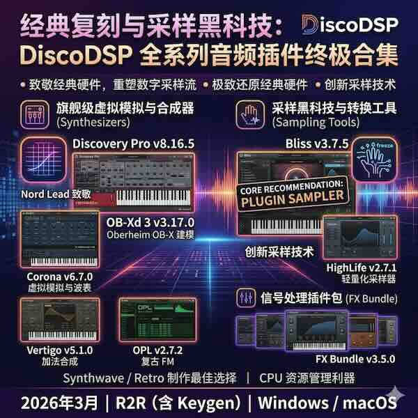 本合集包含了 DiscoDSP 旗下的全部核心产品,涵盖了波表合成、虚拟模拟、加法合成以及强大的采样工具,是追求复古音色与现代创作效率的制作人的必备武器库。