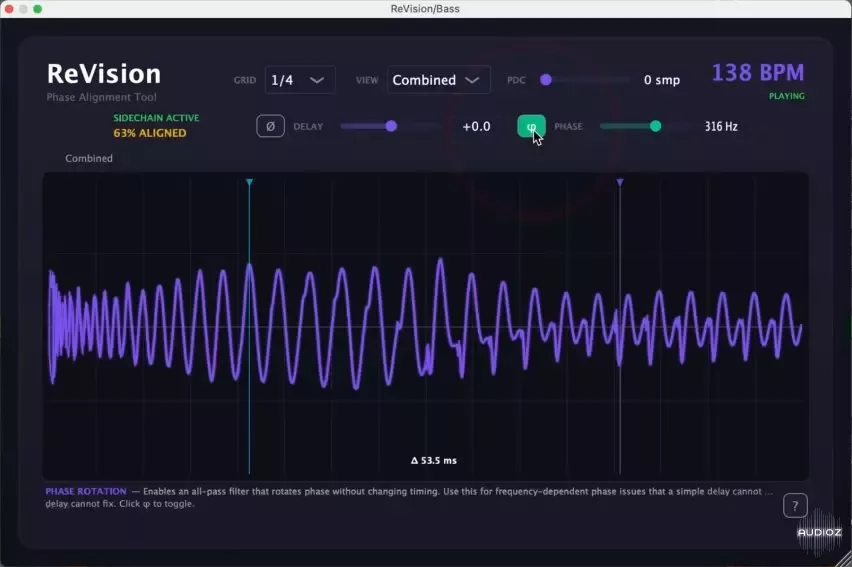 ReVision 是世界上首款专门为您直观展示底鼓 (Kick) 与贝斯 (Bass) 是否完美协同工作(或互相毁灭)的视觉化相位对齐插件。它不是那种让人眼花缭乱的传统示波器,也不是普通的通用相位计,而是一个目的极其明确的终极低频拯救工具。