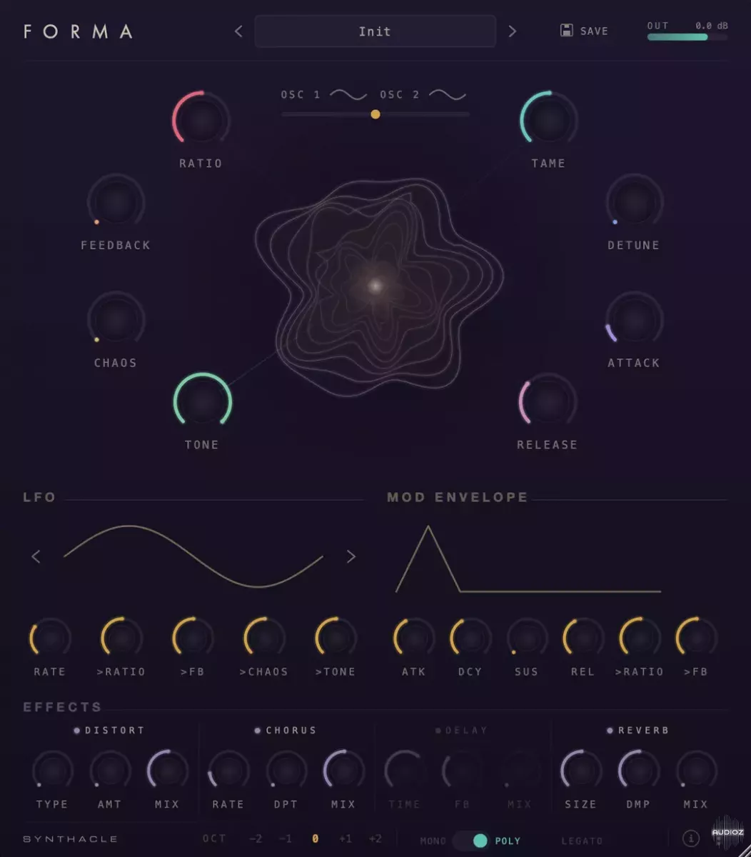 Synthacle Forma 是一款极具破坏力与实验性的交叉反馈 FM 合成器。与市面上传统的单向路由调频 (FM) 合成器不同,Forma 的核心在于它的“互相伤害”机制——两个振荡器同时将信号反馈给对方,并巧妙地注入了混沌噪声 (Chaos noise injection)。